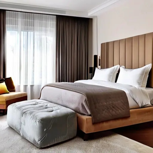Расположите кровать по центру или у стены, чтобы подчеркнуть мягкое изголовье и обеспечить комфортный доступ.